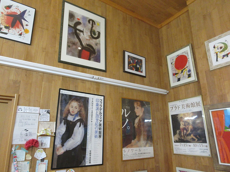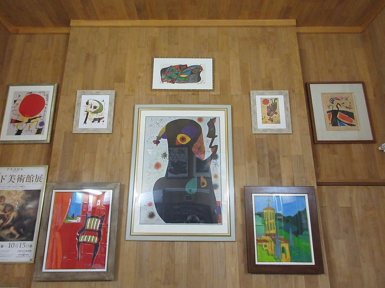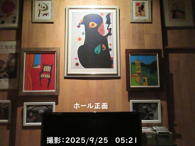 仏画家の油絵2点を正面左右に掲示:各々の上部の MIRO 小品はホール10周年記念で追加♪
